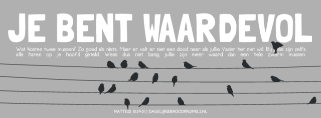 Mussen kosten bijna niets, je hebt er al twee voor een paar cent. Toch valt er dankzij de macht van God, jullie Vader, geen mus zomaar dood op de grond. God weet zelfs hoeveel haren je op je hoofd hebt. Je hoeft dus niet bang te zijn. Jullie zijn voor God veel belangrijker dan mussen. — Matteus 10:29-31