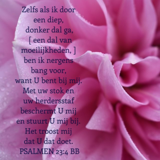 Zelfs als ik door een diep, donker dal ga, [ een dal van moeilijkheden, ] ben ik nergens bang voor, want U bent bij mij. Met uw stok en uw herdersstaf beschermt U mij en stuurt U mij bij. Het troost mij dat U dat doet.
