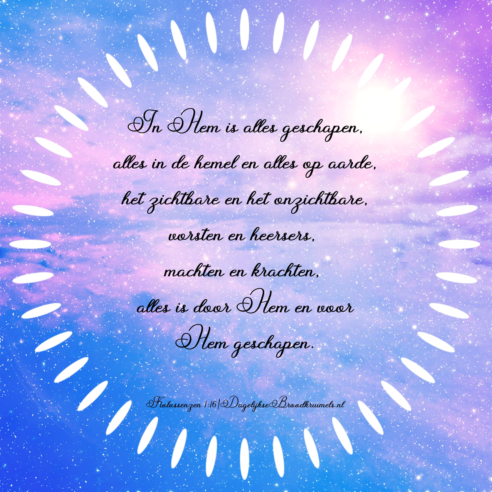 In hem is alles geschapen, alles in de hemel en alles op aarde, het zichtbare en het onzichtbare, vorsten en heersers, machten en krachten, alles is door hem en voor hem geschapen.