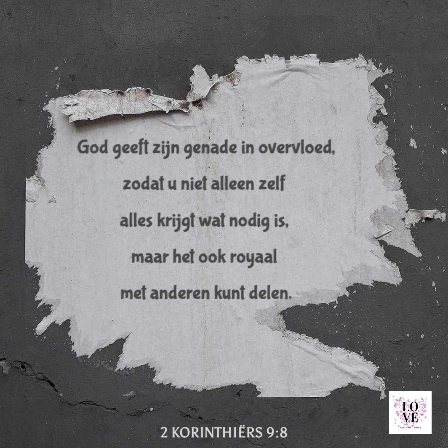 2 Korinthiërs 9:8 On 10 februari 2020 door Love Heals All ThingsinCreatieve christelijke plaatjes, Pinterest God geeft zijn genade in overvloed, zodat u niet alleen zelf alles krijgt wat nodig is, maar het ook royaal met anderen kunt delen.2 Korinthiërs 9:8 HTB Voel je vrij om te delen! Delen=Getuigen Klik om te delen op Facebook (Opent in een nieuw venster) Facebook Klik om op Pinterest te delen (Opent in een nieuw venster) Pinterest Klik om te delen op WhatsApp (Opent in een nieuw venster) WhatsApp Klik om dit te e-mailen naar een vriend (Opent in een nieuw venster) E-mail Klik om te delen op Telegram (Opent in een nieuw venster) Telegram Klik om af te drukken (Opent in een nieuw venster) Print Vind-ik-leuk Aan het laden... Gerelateerd