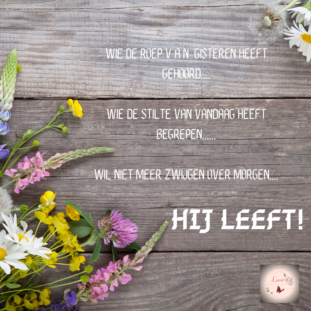 Hij Leeft On 11 april 2020 door Love Heals All ThingsinCreatieve christelijke plaatjes, Pinterest Wie de roep van gisteren heeft gehoord…wie de stilte van vandaag heeft begrepen… wil niet meer zwijgen over morgen… Hij Leeft! Auteur onbekend! Voel je vrij om te delen! Delen=Getuigen Klik om te delen op Facebook (Opent in een nieuw venster) Facebook Klik om op Pinterest te delen (Opent in een nieuw venster) Pinterest Klik om te delen op WhatsApp (Opent in een nieuw venster) WhatsApp Klik om dit te e-mailen naar een vriend (Opent in een nieuw venster) E-mail Klik om te delen op Telegram (Opent in een nieuw venster) Telegram Klik om af te drukken (Opent in een nieuw venster) Print Vind-ik-leuk Aan het laden... Gerelateerd