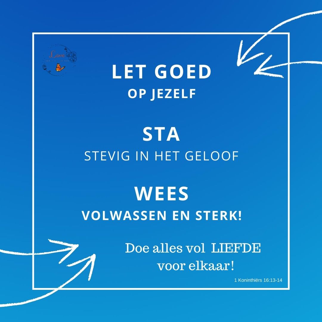 1 Korinthiërs 16:13-14 On 31 augustus 2020 door Love Heals All ThingsinCreatieve christelijke plaatjes, Pinterest Let goed op jezelf. Sta stevig in het geloof. Wees volwassen en sterk! Doe alles vol liefde voor elkaar. 1 Korinthiërs 16:13-14 Voel je vrij om te delen! Delen=Getuigen Klik om te delen op Facebook (Opent in een nieuw venster) Facebook Klik om op Pinterest te delen (Opent in een nieuw venster) Pinterest Klik om te delen op WhatsApp (Opent in een nieuw venster) WhatsApp Klik om dit te e-mailen naar een vriend (Opent in een nieuw venster) E-mail Klik om te delen op Telegram (Opent in een nieuw venster) Telegram Klik om af te drukken (Opent in een nieuw venster) Print Vind-ik-leuk Aan het laden... Gerelateerd