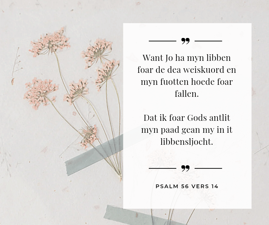 Psalm 56:14 On 20 juli 202320 juli 2023 door Love Heals All ThingsinCreatieve christelijke plaatjes, Pinterest Want Jo ha myn libben foar de dea weiskuord en myn fuotten hoede foar fallen.Dat ik foar Gods antlit myn paad gean my in it libbensljocht. Psalm 56:14 Voel je vrij om te delen! Delen=Getuigen Klik om te delen op Facebook (Opent in een nieuw venster) Facebook Klik om op Pinterest te delen (Opent in een nieuw venster) Pinterest Klik om te delen op WhatsApp (Opent in een nieuw venster) WhatsApp Klik om dit te e-mailen naar een vriend (Opent in een nieuw venster) E-mail Klik om te delen op Telegram (Opent in een nieuw venster) Telegram Klik om af te drukken (Opent in een nieuw venster) Print Vind-ik-leuk Aan het laden... Gerelateerd