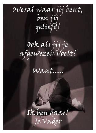 Maar wat mogen we dankbaar zijn dat Hij dit voor ons heeft gedaan, zodat wij onze pijn, onze zonden, onze afwijzing bij deze God mogen brengen… en omdat Jezus dit voor ons heeft gedragen ziet God ons mensen niet meer voor Hem staan maar ziet Hij de Here Jezus voor hem staan… Wij zijn Zijn geliefde zonen en dochters door de Here Jezus… al onze zonden, onze pijn, onze afwijzingen zijn vergeven, vernietigd aan dat kruis.. en als wij het dan bij God brengen, mogen we het ook aannemen dat het zo is… en Hij gooit het in een denkbeeldige zee waar een bordje in staat verboden te vissen…
