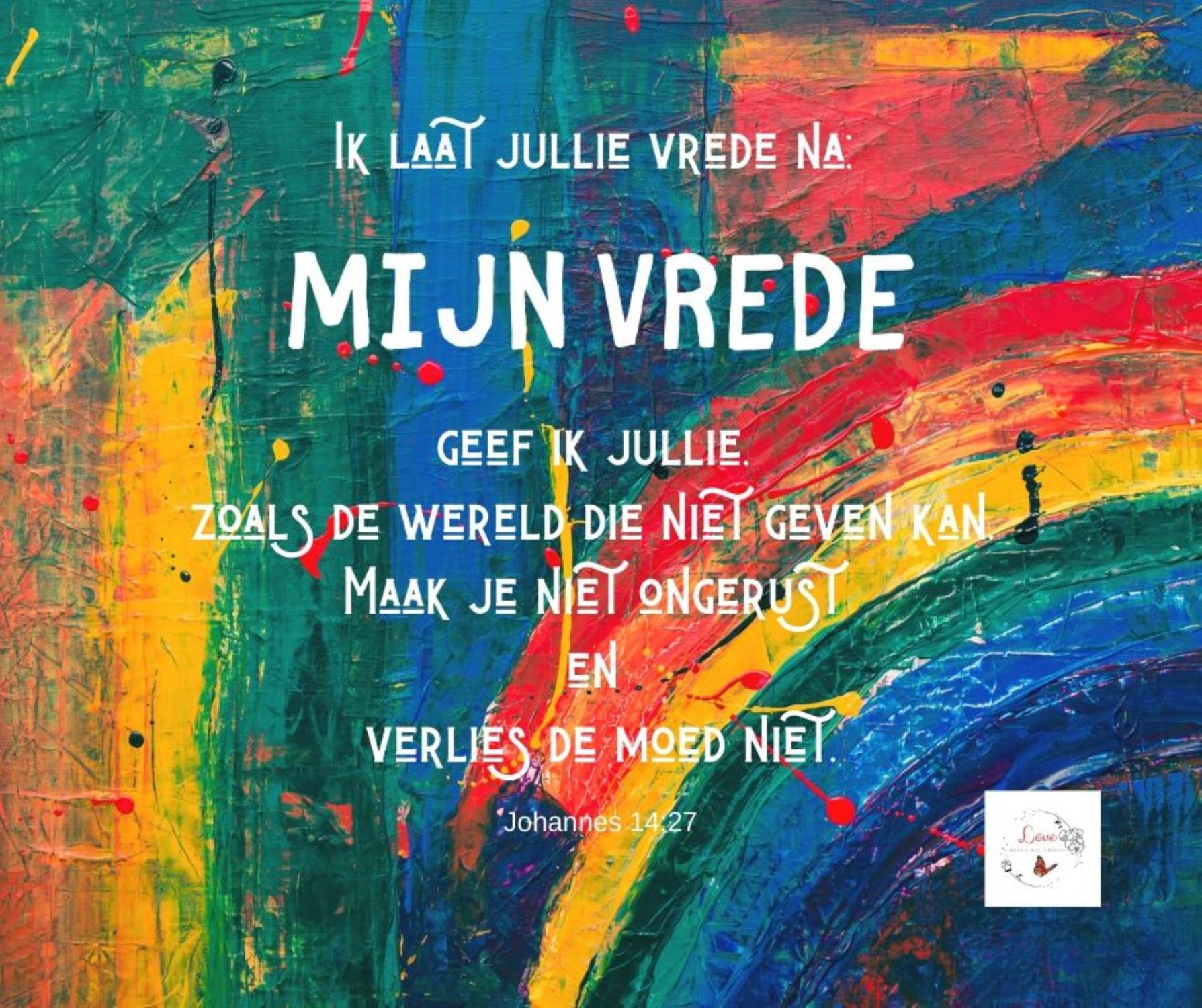 Ik laat jullie vrede na; mijn vrede geef ik jullie, zoals de wereld die niet geven kan. Maak je niet ongerust en verlies de moed niet. Johannes 14:27