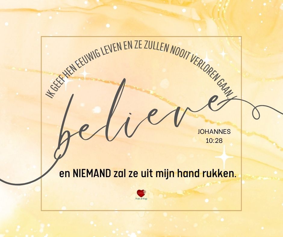 Het Evangelie naar Johannes 10:28 EBV24. Ik geef hun eeuwig Leven en zij zullen in eeuwigheid niet verloren gaan en niemand zal ze uit mijn hand rukken.