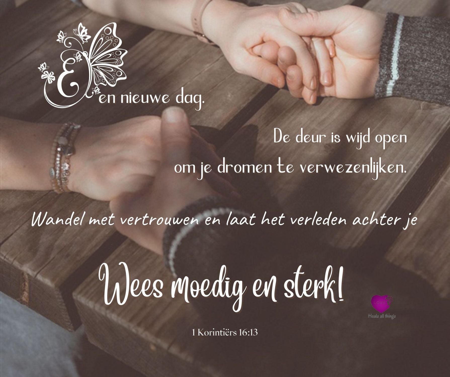 Een nieuwe dag, de deur is wijd open om je dromen te verwezenlijken, wandel met vertrouwen en laat het verleden achter je, wees moedig en sterk. 1 korinthiërs 16:13