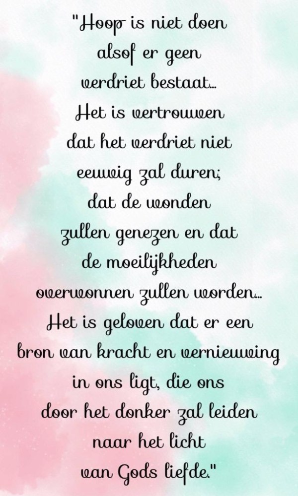 Oke zul je zeggen maar je bent nog steeds ziek… ja dat klopt en misschien blijft dat ook zo en geneest God mij niet nu, maar ik weet wel dat Hij overal bij is in mijn pijn..in mijn moe zijn… in mijn eenzaamheid hierdoor.. Hij geeft wel wegen om er mee om te gaan en toch een licht te zijn in deze donkere wereld…. Hij geeft mensen om ons heen die ons helpen… mensen die een troost zijn in ons verdriet… maar vergeet dan niet dat God deze mensen geeft… en je mag dan ook leren om het aan te nemen..