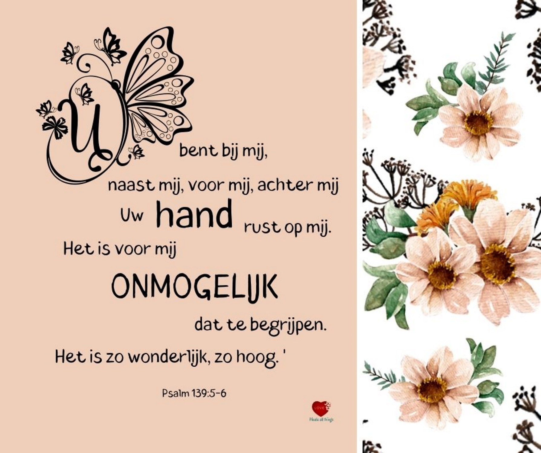 U bent bij mij, naast mij, voor mij, achter mij. Uw hand rust op mij. Het is voor mij onmogelijk dat te begrijpen. Het is zo wonderlijk, zo hoog Psalm 139:5-6