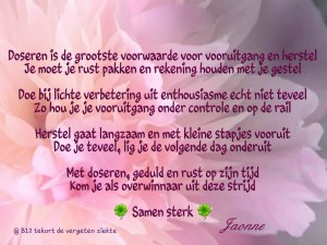 Natuurlijk wil ik graag helemaal beter worden, wil ik graag doen wat al die anderen kunnen, wil ik graag zonder die vreselijke pijnen leven, zonder al die pijnstillers die mij door de dag heen moeten slepen… maar de volledige genezing is er niet… dat is (nog) niet gebeurt… en het klinkt gek maar ik heb er Vrede mee, Vrede en Rust mee gekregen, het is niet meer mijn eerste streven….